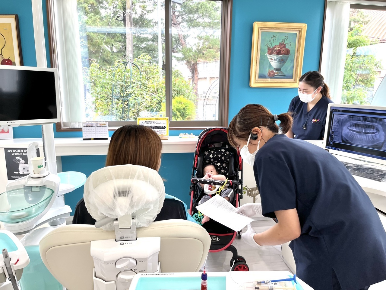 当院では、毎回の治療時に「今日の治療内容」をご説明。レントゲン写真をはじめとした写真や図解イラストなどをご覧いただき、治療内容とお口の状況を詳しくお伝えしながら治療を進めていきます。疑問や不安が出てきましたら、歯科医師およびスタッフに何なりとお声がけください。
